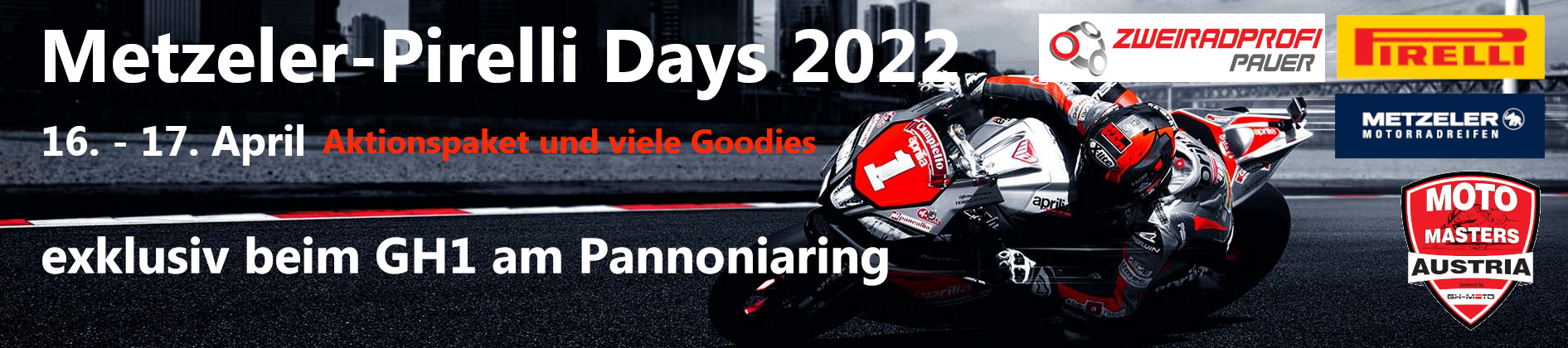 Wie jedes Jahr üblich steht der GH1 am Pannonia ganz im Zeichen von Metzeler&Pirelli. Bei diesem Event besteht wieder die Möglichkeit tolle Aktionspreise, Geschenke und Wissenswertes über die neusten Entwicklungen bei Metzeler&Pirelli zu erfahren. Neben 2 Fachspezialisten, die euch direkt von Pirelli-Metzeler Austria für Rat & News zur Verfügung stehen, habt ihr die Möglichkeit die Reifen zu Sonderkonditionen bei unserem Reifendienst Zweiradprofi Pauer zu erwerben.